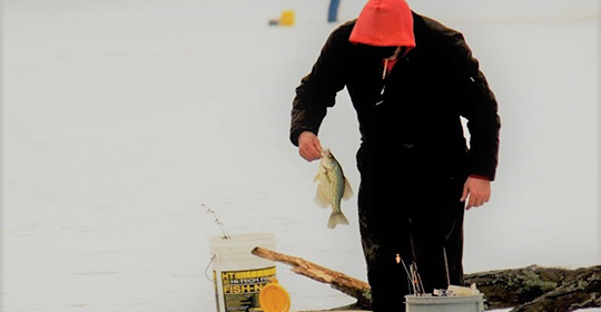 The popularity of Indian Lake in west-central Ohio for ice fishing is because it is one of the first lakes to freeze due to its shallow water. The 5,800-acre lake gives anglers lots of spots to try for crappie and saugeye. Indian Lake is a nice location for ice fishing because the small cottage community surrounding it offers various access points like Indian Lake State Park and there are many nearby restaurants for warming up afterwards.