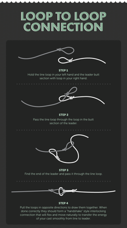 Start by connecting the main fly line to the fly leader butt. While the needle nail knot is the most secure of all the leader-line connections, it takes more time to tie and is harder to master than loop to loop connections. Some leader line even comes pre-tied with perfection loops. Don't let the amount of choices overwhelm you. A good fly shop will not only help you choose, but may even set up your line and leader for you.